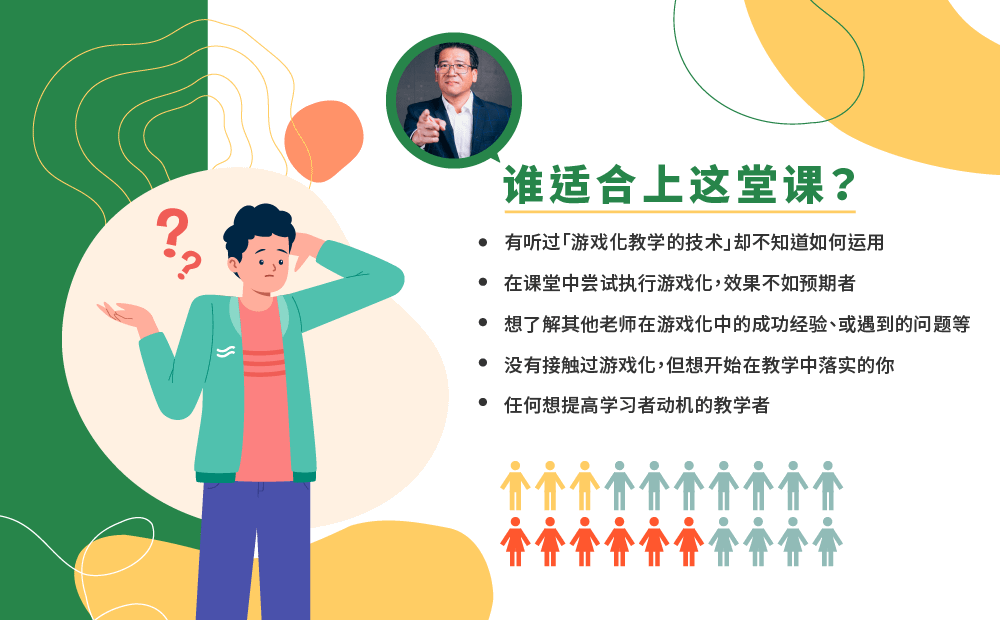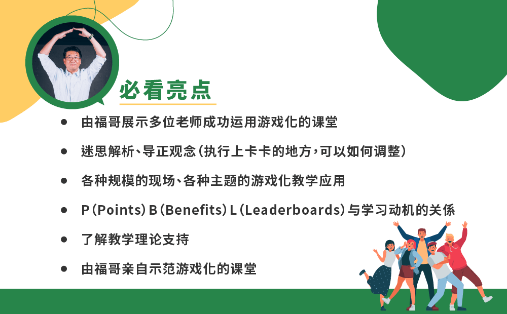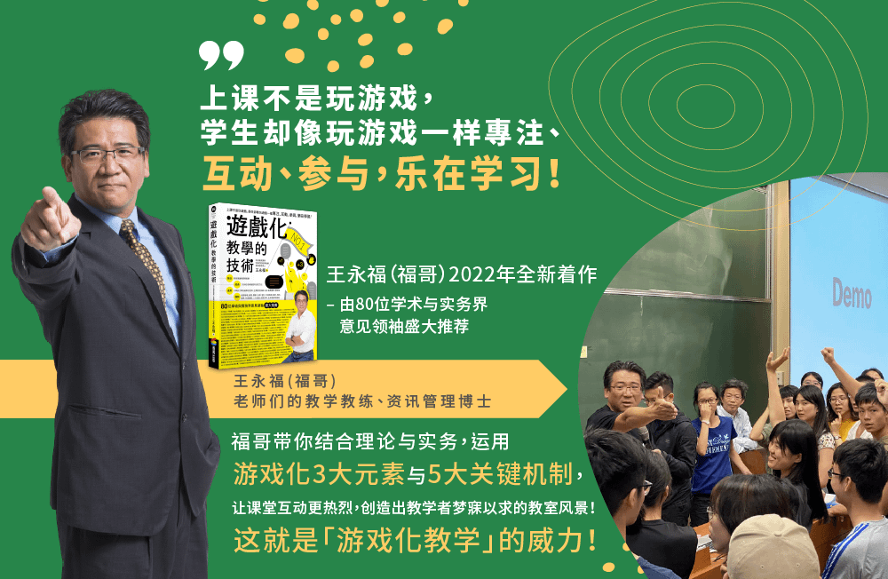 由福哥亲自讲解、示范及分享游戏化教学的技术课堂风景,教学中,运用游戏化元素与关键机制,让课堂互动更热烈,创造出教学者梦寐以求的教室风景!这就是「游戏化教学」的威力!