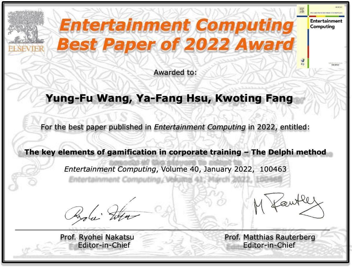 福哥分享的方法,不仅实务验证有效,也用了严谨的学术理论验证。论文「The key elements of gamification in corporate training – The Delphi method」(中译:企业训练游戏化教学的关键要素-德尔菲研究法」,荣获国际期刊 Entertainment Computing 全年度只挑一篇的: 2022 年度最佳论文(2022 Best Paper Award)