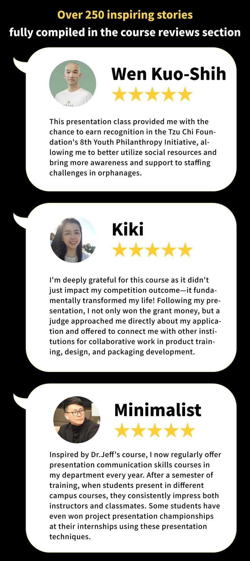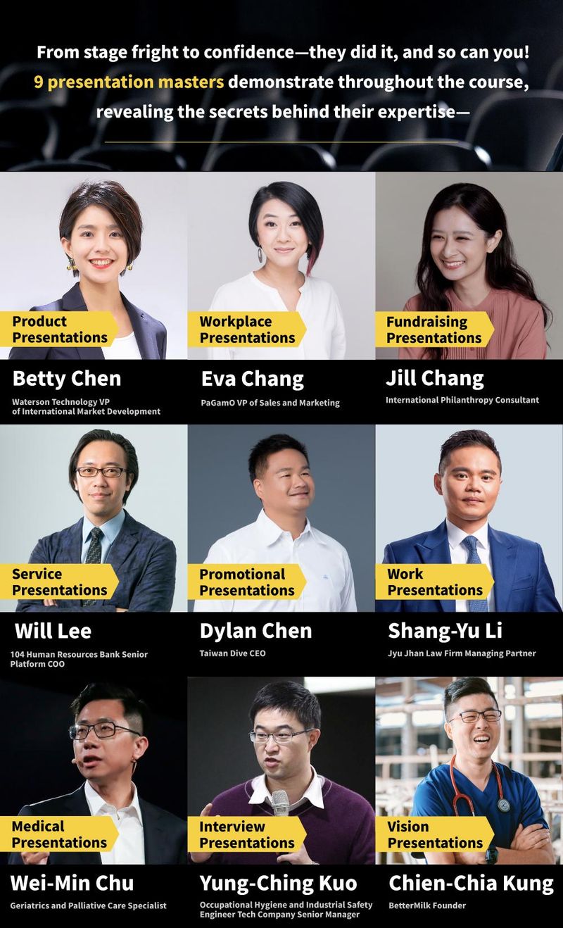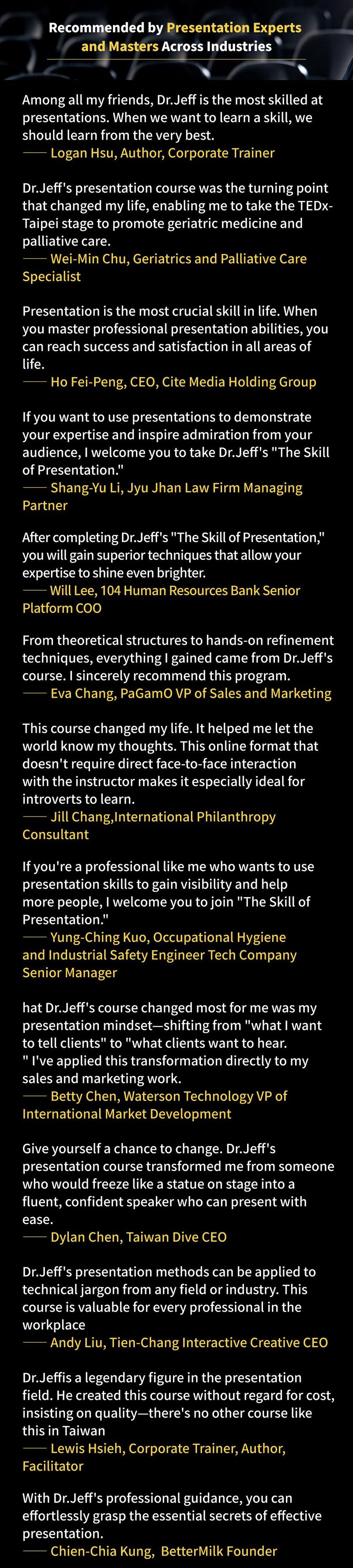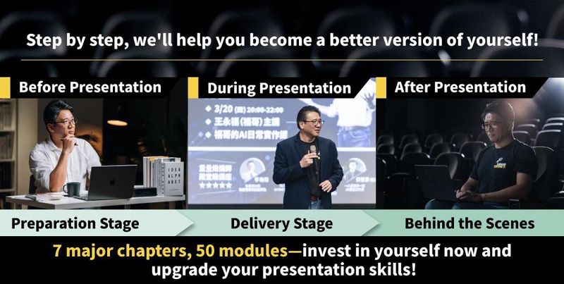 Professional Presentation Skills founder—Wang Yongfu (Dr. Jeff), breaking through online course limitations with a 4-camera, 4-angle setup to create the most premium online course specifications. 14 experts and masters provide demonstrations and discussions, offering comprehensive mastery of presentation techniques and secrets.