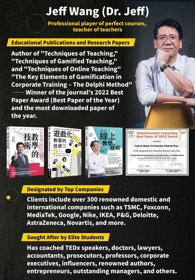 Jeff Wang (Dr. Jeff), top professional instructor, presentation skills and teaching coach, Information Ph.D., and founder of F Academy. His clients include renowned companies such as TSMC, Foxconn, MediaTek, Siemens, major financial holding companies, National Taiwan University Hospital, Novartis, Google, Nike, Gucci, IKEA, and others, covering over 70% of Taiwan's top 100 listed companies. He is also a presentation coach for many professionals including doctors, lawyers, accountants, and prosecutors, as well as a teacher of teachers and coach of coaches.